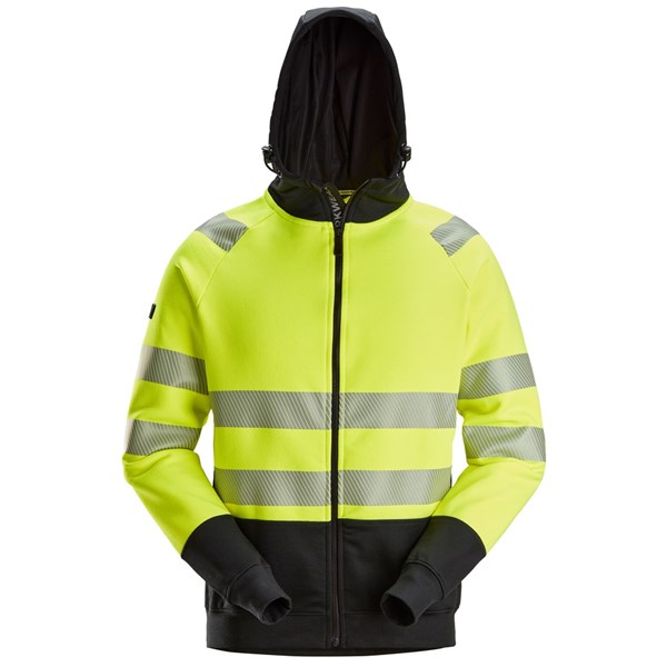 Varselhuvtröja med hellång dragkedja. Huvtröjan är tillverkad av ett mjukt polyester- och bomullstyg med borstad insida för daglig arbetskomfort. Jackan har segmenterat reflextryck, smutsområden, anpassningsbar huva, reflexband över den främre dragkedjan, två fickor med dragkedja och reflexdetaljer, samt märke på höger ärm. Den kommer också med ribbstickning i hals, ärmslut och nederkant.